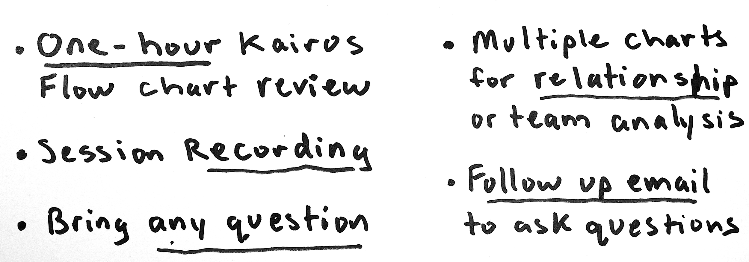 After thousands of sessions with people around the globe (US, Hong Kong, China, Japan, Singapore, Germany, Italy, Thailand, Romania) the most common things that the Kairos Flow can reveal: