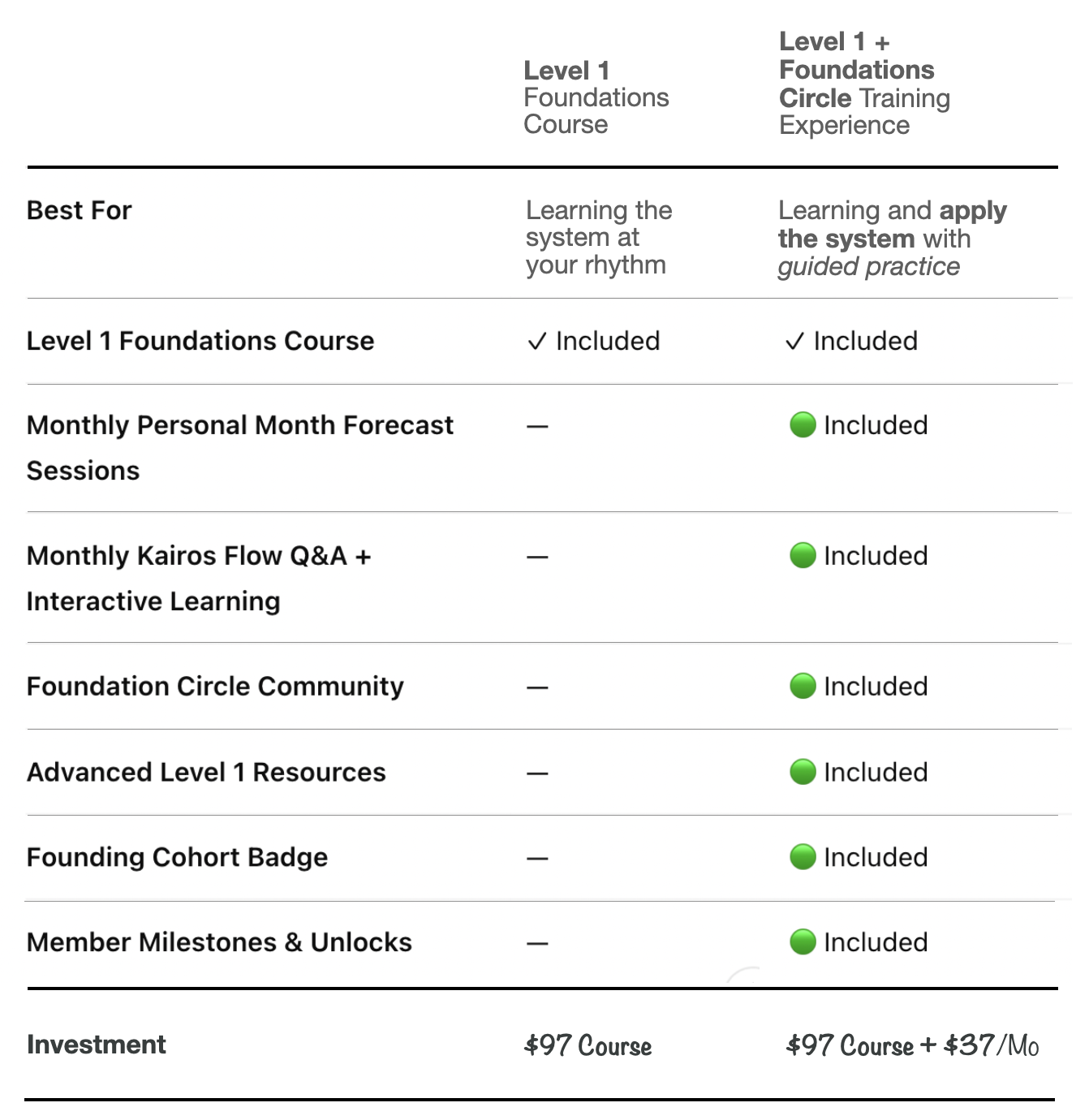 Private learning lab, monthly live trainings/Q&A, topic specific channels for deeper discussions, peer support, advanced level 1 resources…special bonus opportunities and Founding Cohort Badge